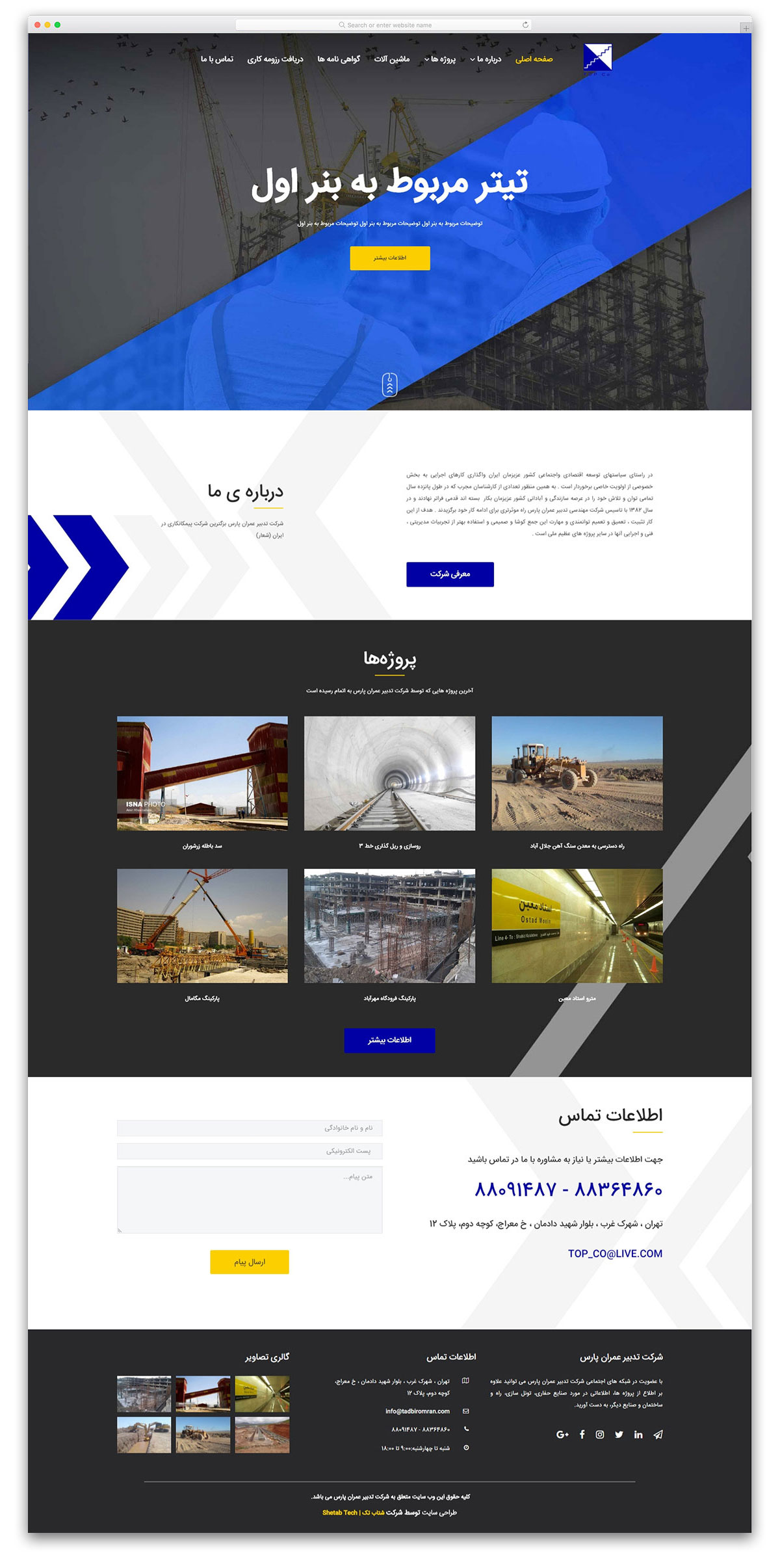 امکانات:واکنش گرا ( Responsive ) ،بنر اسلاید شو ،جستجو ،بخش پروژه ها ،بخش گواهی نامه ها ،گالری تصاویر ،بخش اخبار ،بخش مقاله ،بخش دریافت رزومه ،نقشه گوگل ،فرم تماس