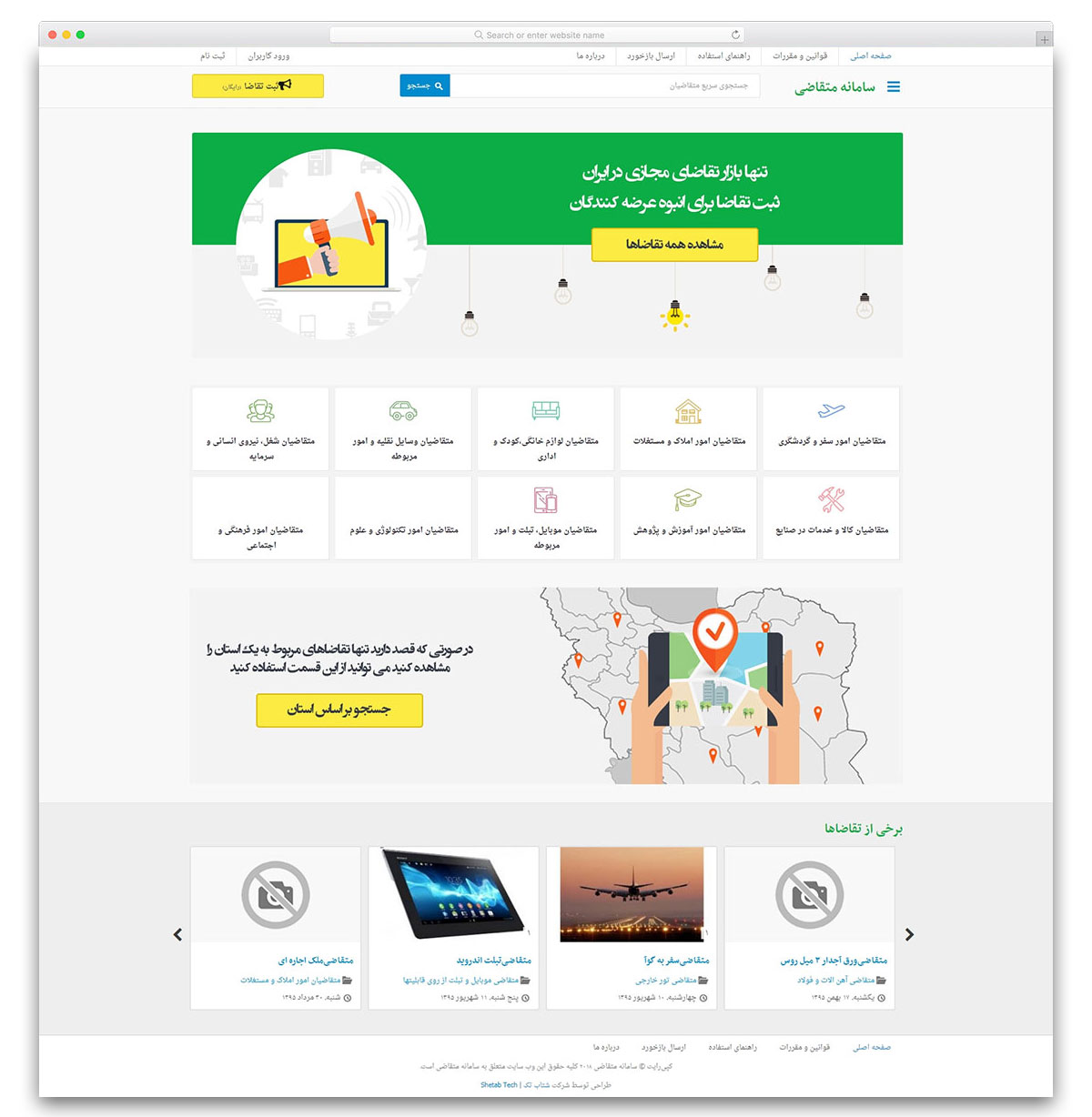 امکانات:واکنش گرا ( Responsive )، ثبت نام از طریق شماره موبایل وتایید شماره، بخش تقاضاها، مقایسه تقاضاها، درج ویدئو در تقاضا، درج عکس در تقاضا، گزارش خطای تقاضا، نمایش لیستی تقاضاها، نمایش جدولی تقاضاها، نمایش تاریخ ثبت تقاضا، ثبت تقاضا توسط کاربر، ثبت نظر برای هر تقاضا، جستجوی پیشرفته تقاضاها، انتشار تقاضا با تأیید مدیر سایت، نمایش تعداد دفعات مشاهده تقاضا، تعریف تقاضاها توسط مدیر سایت، تعریف گروه برای تقاضا توسط مدیر، انتشار تقاضا در شبکه های اجتماعی، جستجوی تقاضاها با استفاده از نقشه تعاملی، تعریف فیلدهای اضافی برای تقاضا توسط مدیر، ذخیره تقاضا در بخش علاقه مندی ها توسط کاربر، نمایش آخرین تقاضاها در صفحه اول به صورت اسلاید شو، مرتب سازی تقاضاها بر اساس تاریخ، مبلغ صعودی و نزولی، پربازدیدترین، تصادفی، فرم تماس، نقشه تماس